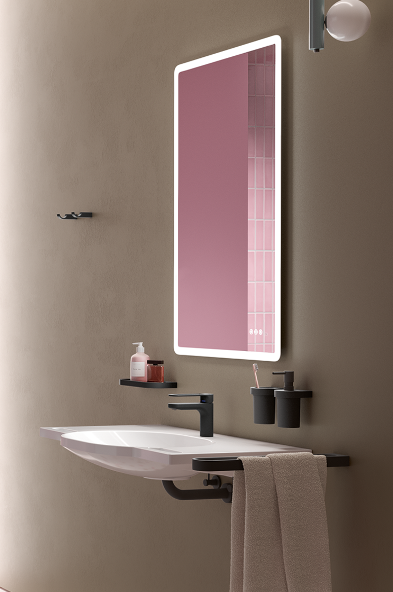 Für NutzerInnen mit eingeschränktem Sehvermögen spielen Blendfreiheit und Kontraste eine zentrale Rolle. Indirektes Licht, satinierte Leuchtenabdeckungen oder LED-Spiegel mit diffuser Ausleuchtung verhindern harte Schatten und Reflexionen. HEWI bietet hierfür beleuchteten Spiegel, die das Gesicht gleichmäßig ausleuchten und gleichzeitig den Raum erhellen.