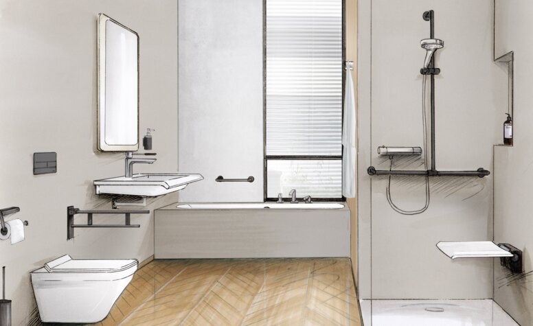 Eine zukunftssichere Badplanung sieht Montagevorbereitungen für Hilfsmittel wie Stützklappgriffe oder Duschsitze bereits in der Bau- oder Sanierungsphase vor – auch dann, wenn sie zunächst nicht installiert werden. HEWI bietet hierzu Systeme wie System 900, bei denen Haltevorrichtungen stilvoll vorgerüstet und bei Bedarf jederzeit ergänzt werden können.
