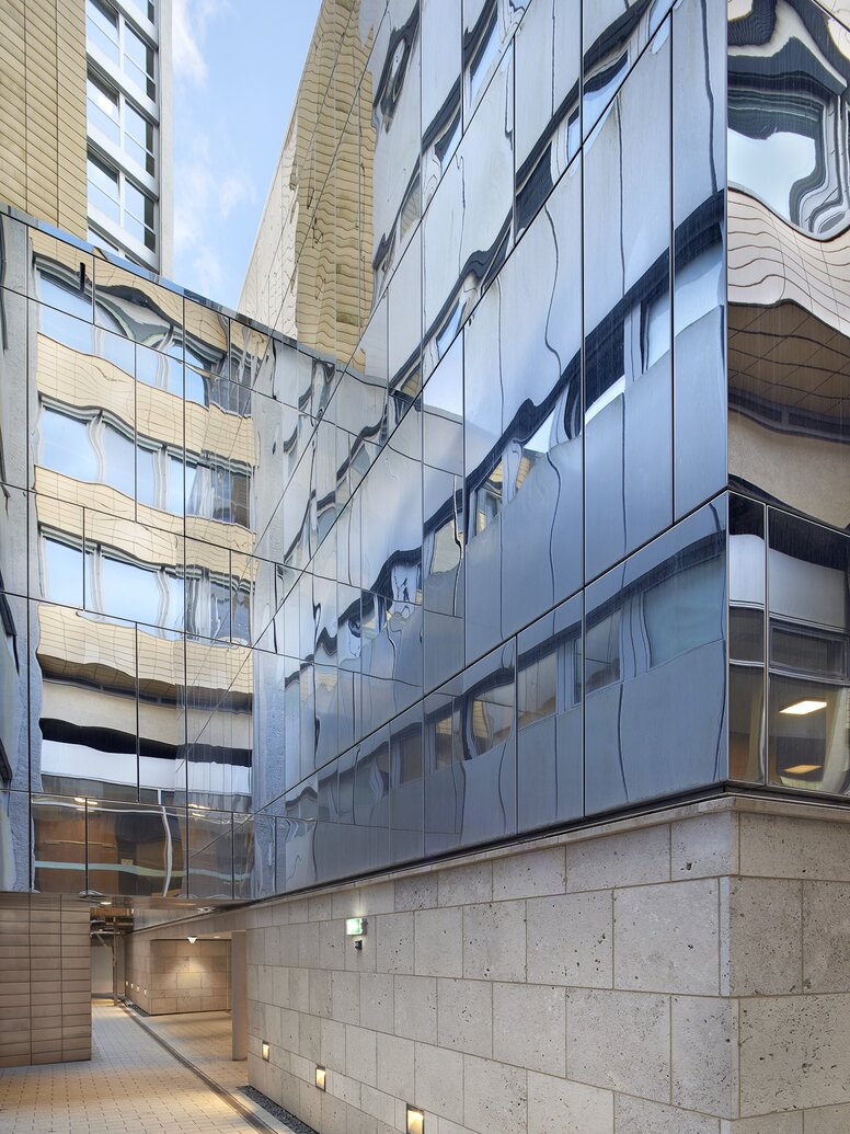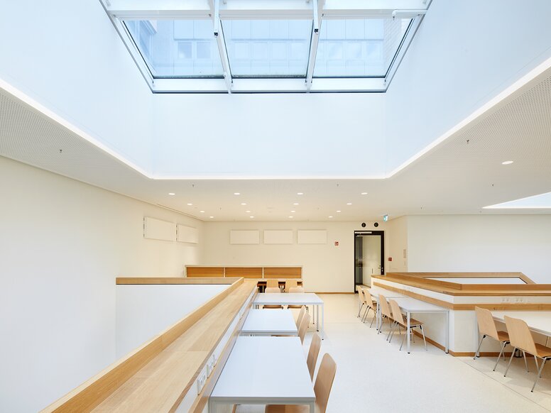 In addition to the refurbishment of the existing building, the usable space was to be expanded. The newly created "Cube" is a free-standing solitaire in the inner courtyard, spread over three storeys and provides around 900 square metres of space for additional student workstations and exchange between the student councils. The new extension is characterised by a polished stainless steel façade, which creates interesting effects and visual relationships thanks to its reflective properties. The façade contributes to a harmonious interplay of old and new by mirroring the historic façade and presenting itself in a visually restrained yet modern way. On the upper floor of the new building there is a light-flooded hall which, together with the four seminar and committee rooms on the ground floor, can also be used for events. The new building is connected to the existing building via bridges on three sides on the ground floor. Newly created meeting rooms in the listed main foyer and the refurbished canteen with an open-plan concept and new energy-efficient building services complement the uses on the ground floor.