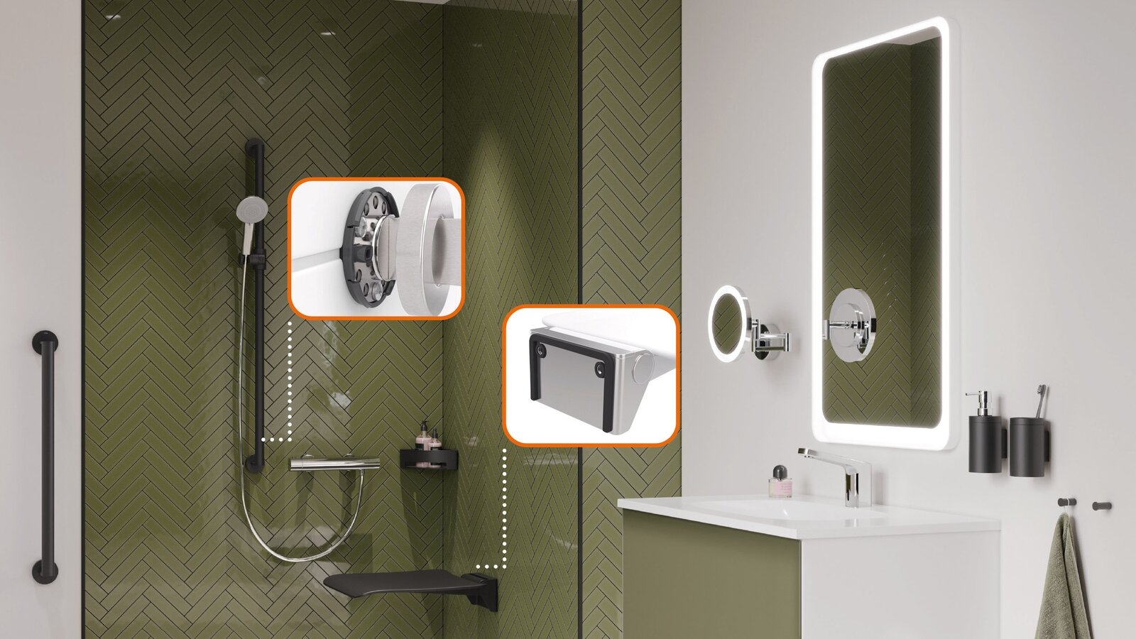 HEWI sealing strips adapt to the respective surface when mounting retaining systems and shower seats as well as folding support handles and seal them so that neither water nor moisture can penetrate. In the case of shower seats, in addition to the sealing tape components, the mini sealing discs for sealing the drilling points provide additional protection.